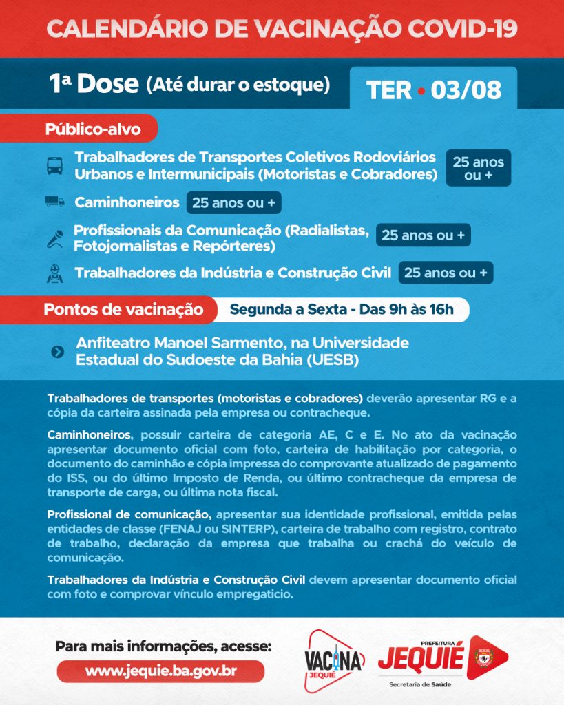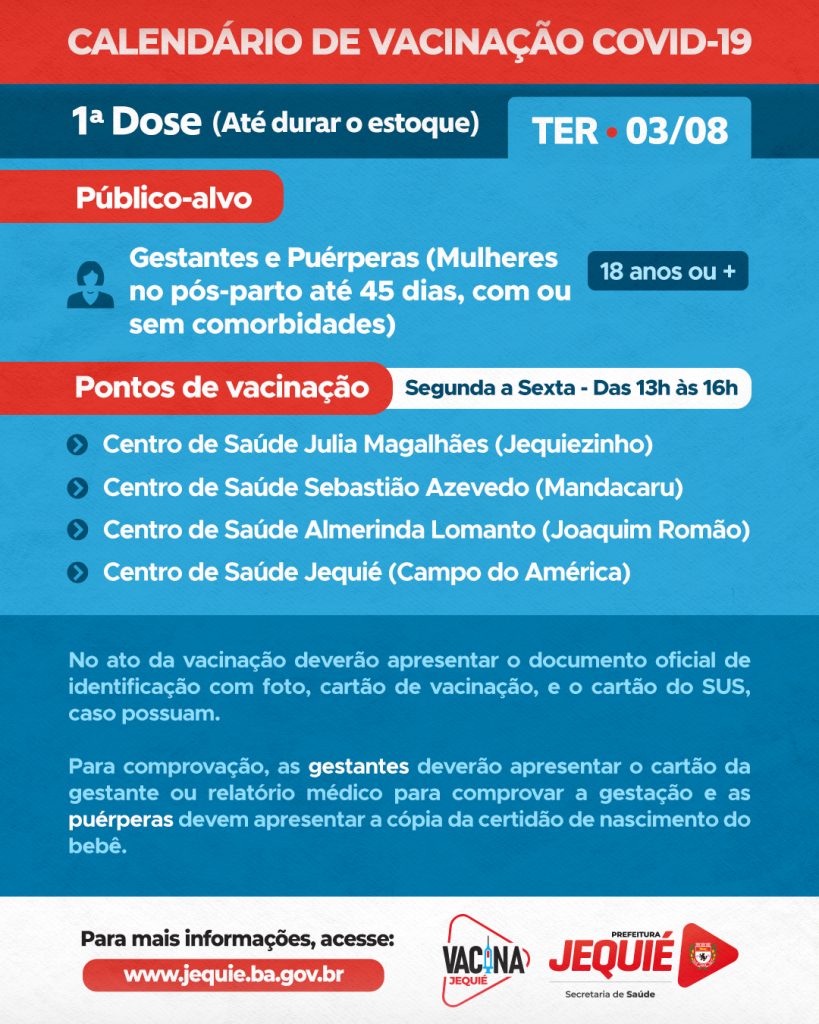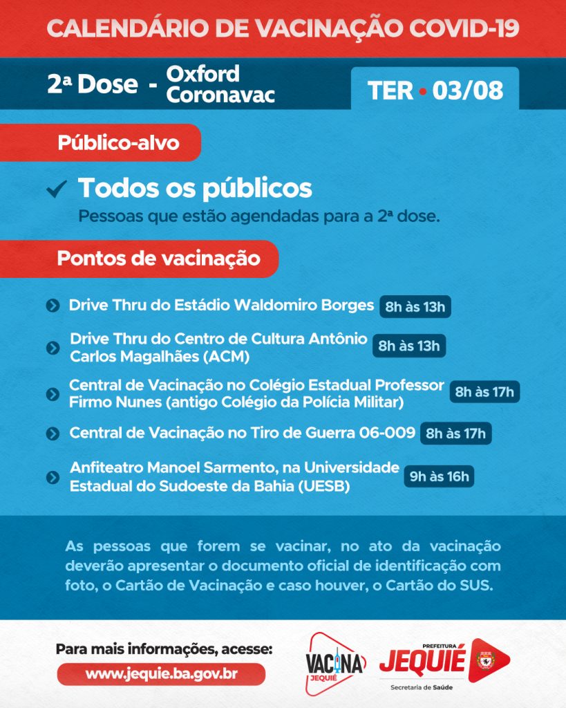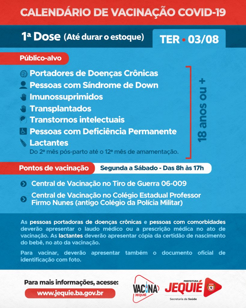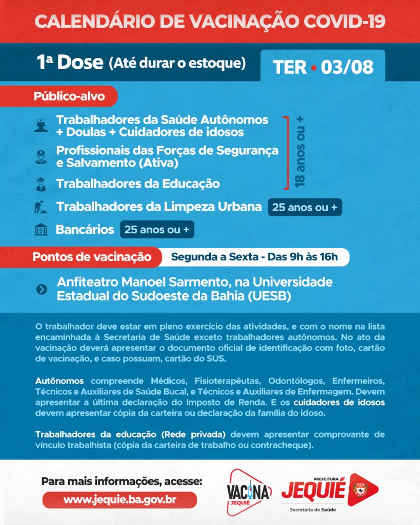 Continuando a ampliar a vacinação contra a Covid-19, a Prefeitura de Jequié, através da Secretaria de Saúde, estará disponibilizando, nesta terça-feira, 3, a imunização para o público com idade a partir de 30 anos.