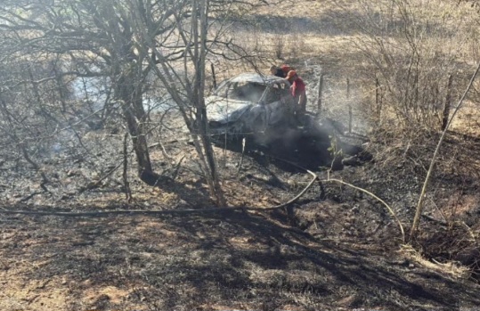 O Corpo de Bombeiros também foi acionado e debelou as chamas que chegaram a atingir a mata no entorno do veículo.
