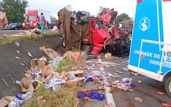 Um grupo de pessoas saqueou parte da carga, que estava espalhada pela pista. O trecho permanece interditado, o que provocou congestionamento na rodovia.
