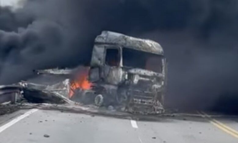 Um caminhão carregado com combustível explodiu na pista e a via ficou totalmente interditada.