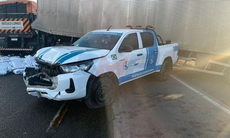Um acidente envolvendo um veículo do Departamento Nacional de Infraestrutura de Transportes (Dnit) e uma carreta deixou a BR-116 totalmente interditada no trecho do município de Brejões, ontem (29).
