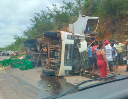 O caminhão, carregado com mangas, acabou tombando e a suspeita é que o motorista tenha perdido o controle da direção na serra, conhecida por curvas acentuadas.