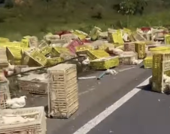 O veículo estava carregado com frango. Parte da carga ficou espalhada no acostamento.