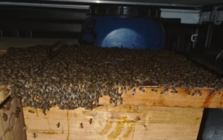 De acordo com um dos técnicos em agropecuária que fez a retirada do enxame do local, acionado pela prefeitura da cidade, o enxame estava alojado no espaço vazio formado sob a laje da escada de um quiosque localizado em frente à pista.