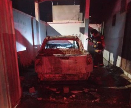 O veículo estava na garagem de uma casa e, em razão do elevado grau de destruição provocado pelas chamas, não foi possível identificar marca ou modelo.