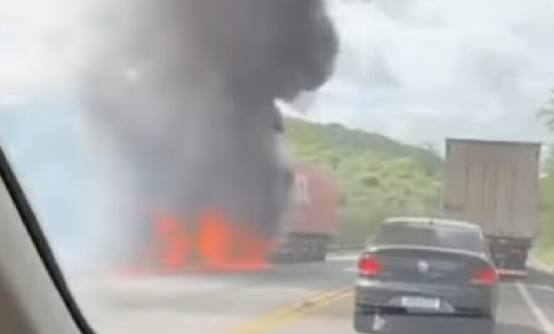Região: Carreta cheia de chocolates pegou fogo na BR-116; veja o vídeo